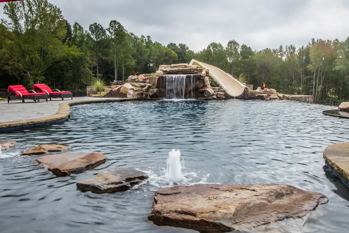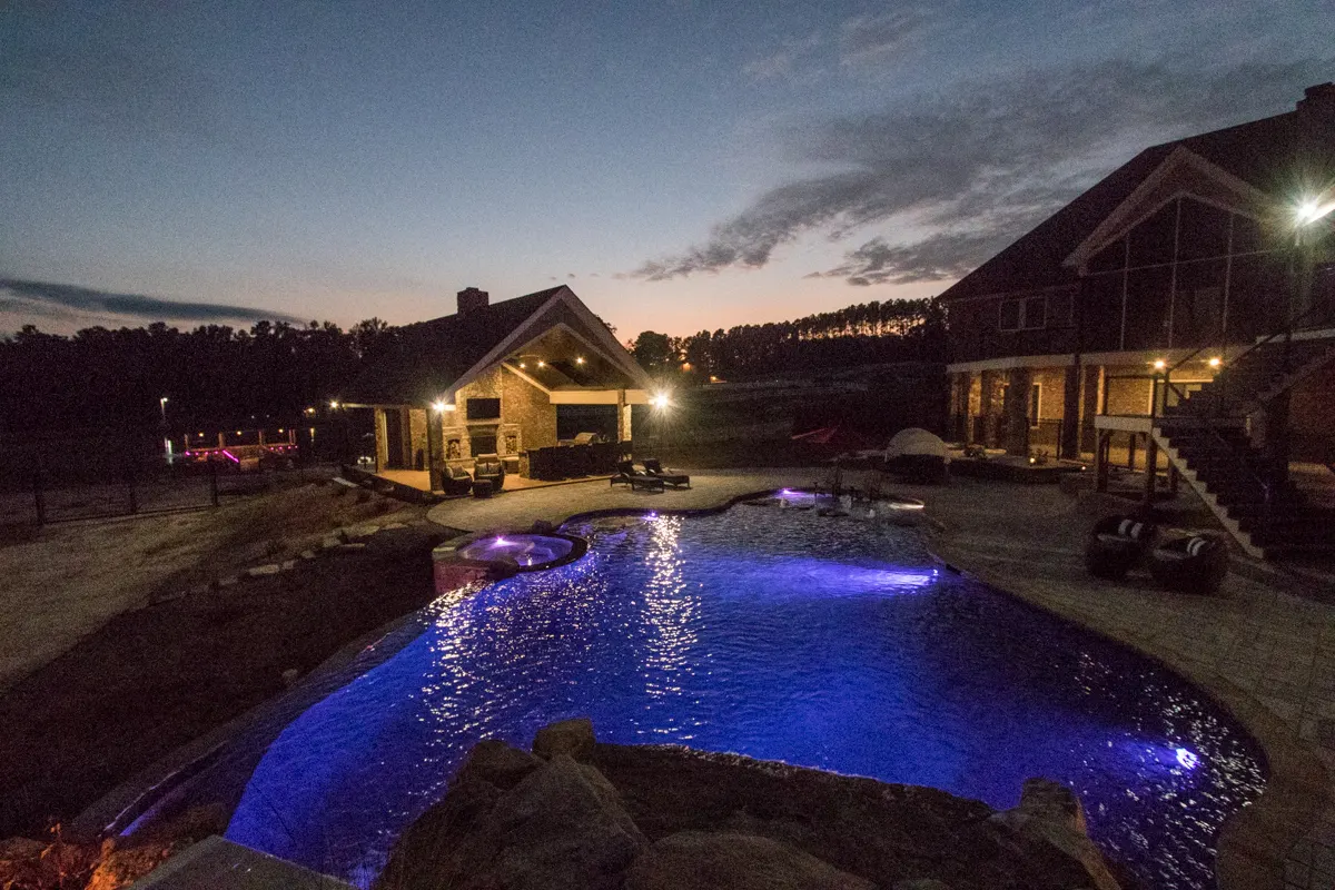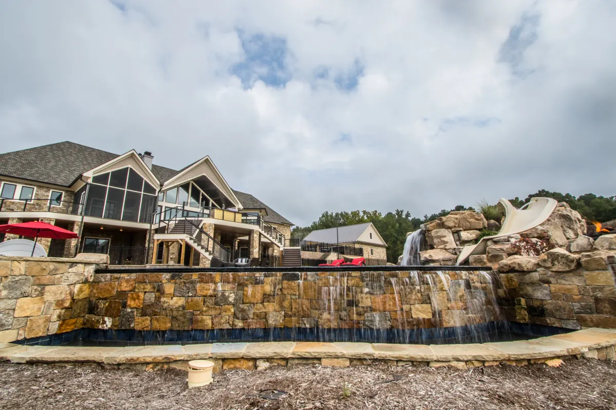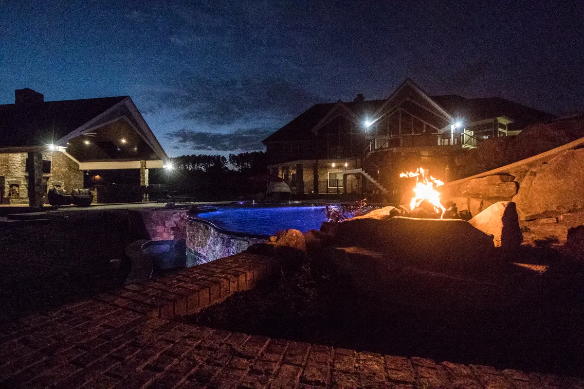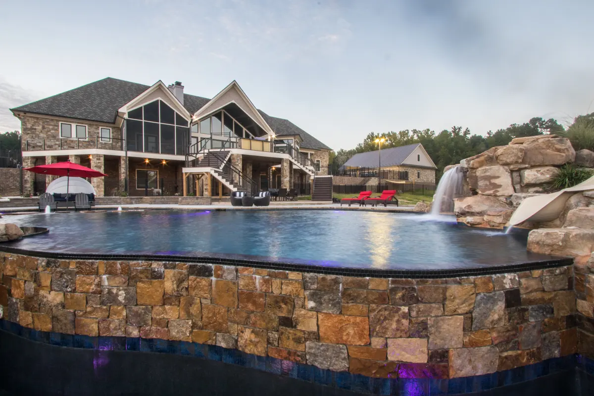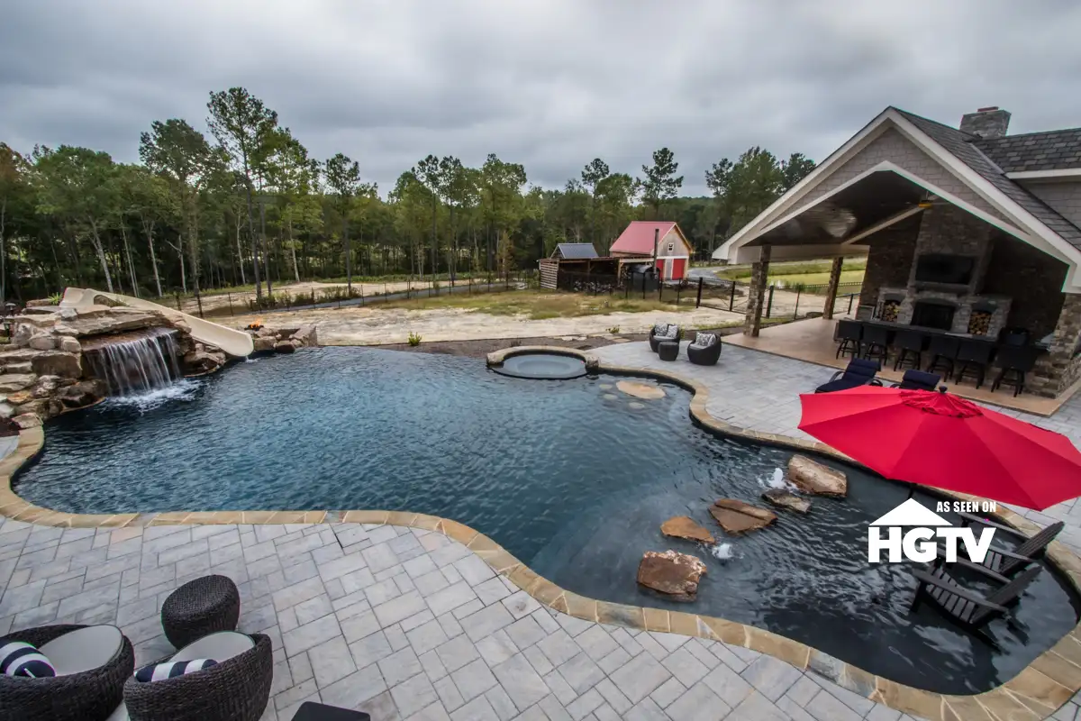 As featured on Season 5 Episode 6 (Slidin’ Into Home) of Pool Kings, we were hired to design a large pool with water features and a pool house on a 100 acre parcel a few miles north of Raleigh. There was a septic system and a lot of yard slope to contend with, as well as a special wood-burning heater for the home and swimming pool.