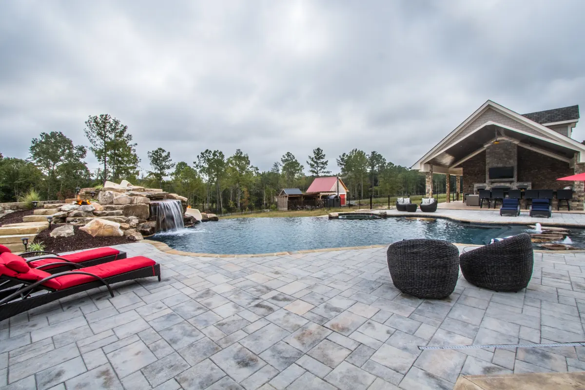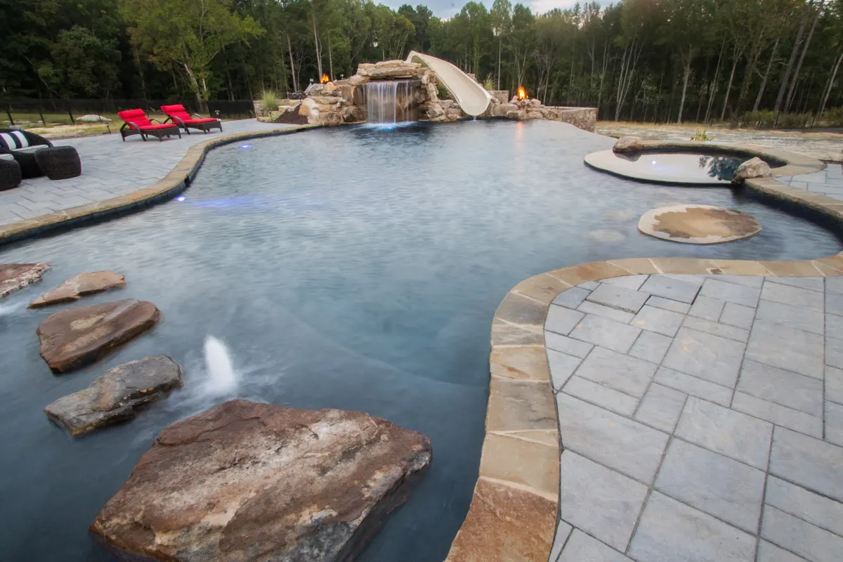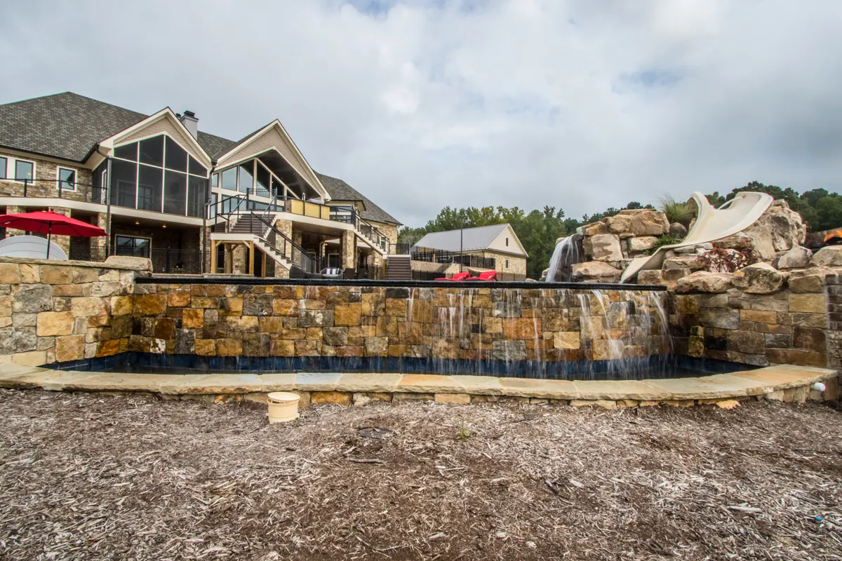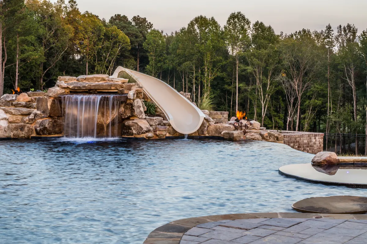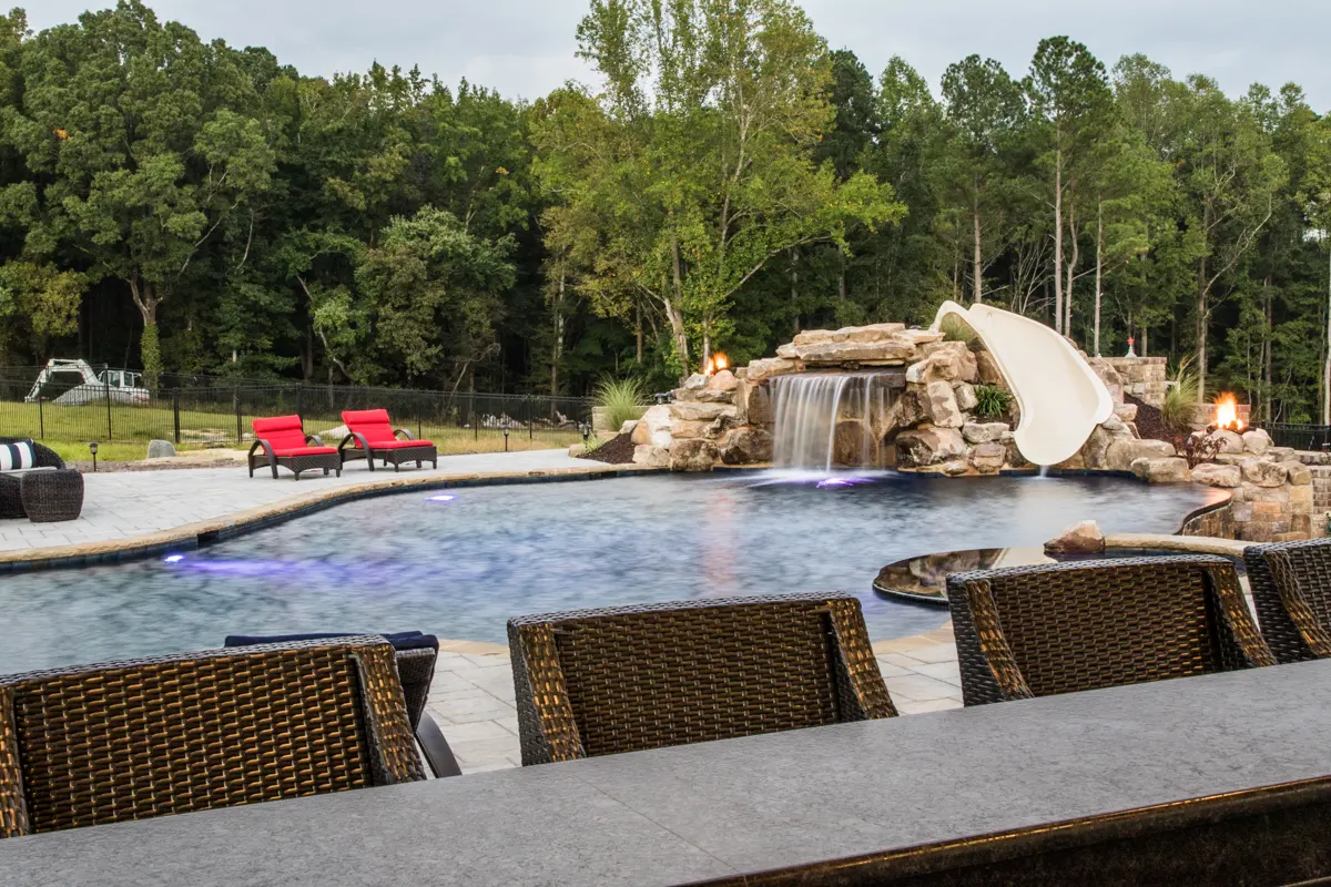 As featured on Season 5 Episode 6 (Slidin’ Into Home) of Pool Kings, we were hired to design a large pool with water features and a pool house on a 100 acre parcel a few miles north of Raleigh. There was a septic system and a lot of yard slope to contend with, as well as a special wood-burning heater for the home and swimming pool.