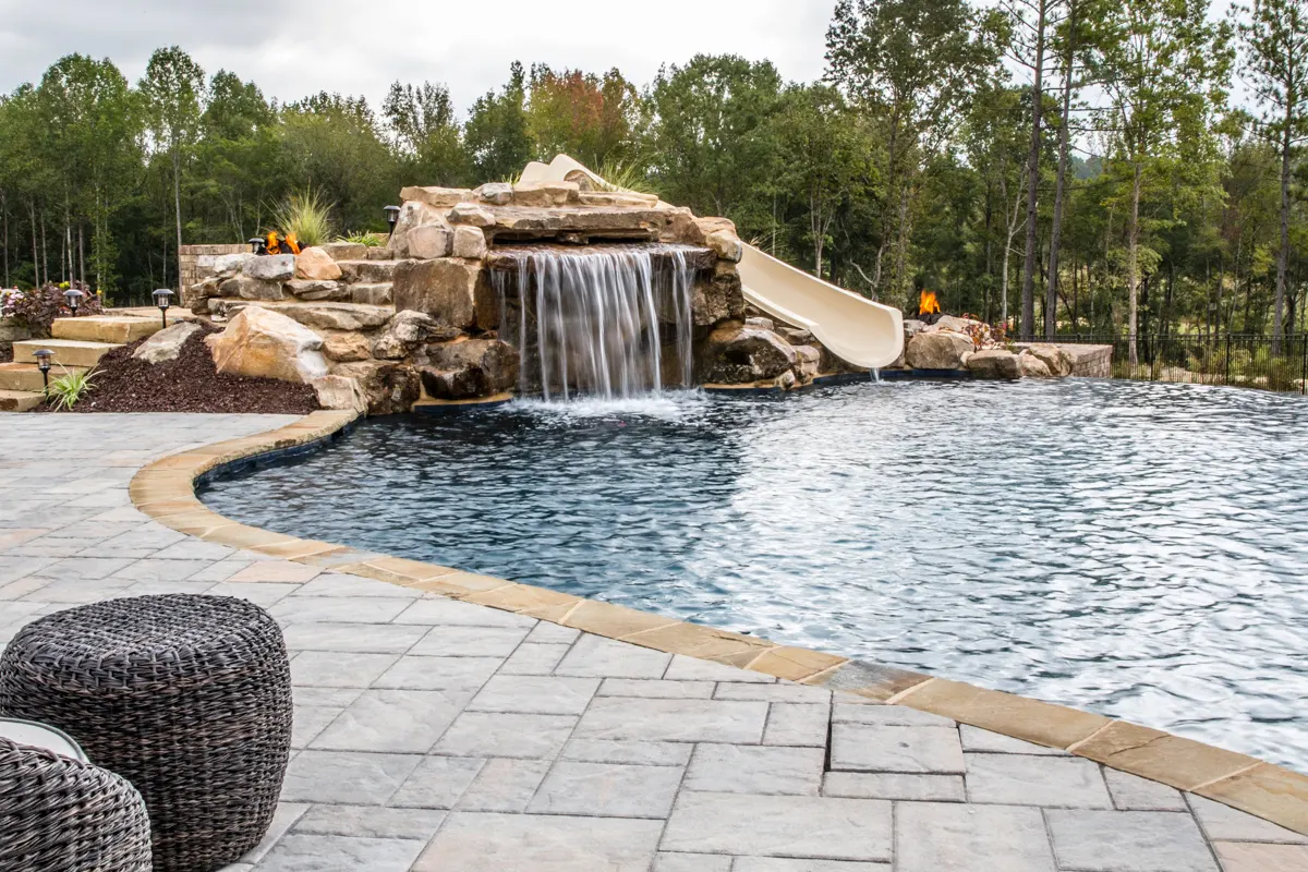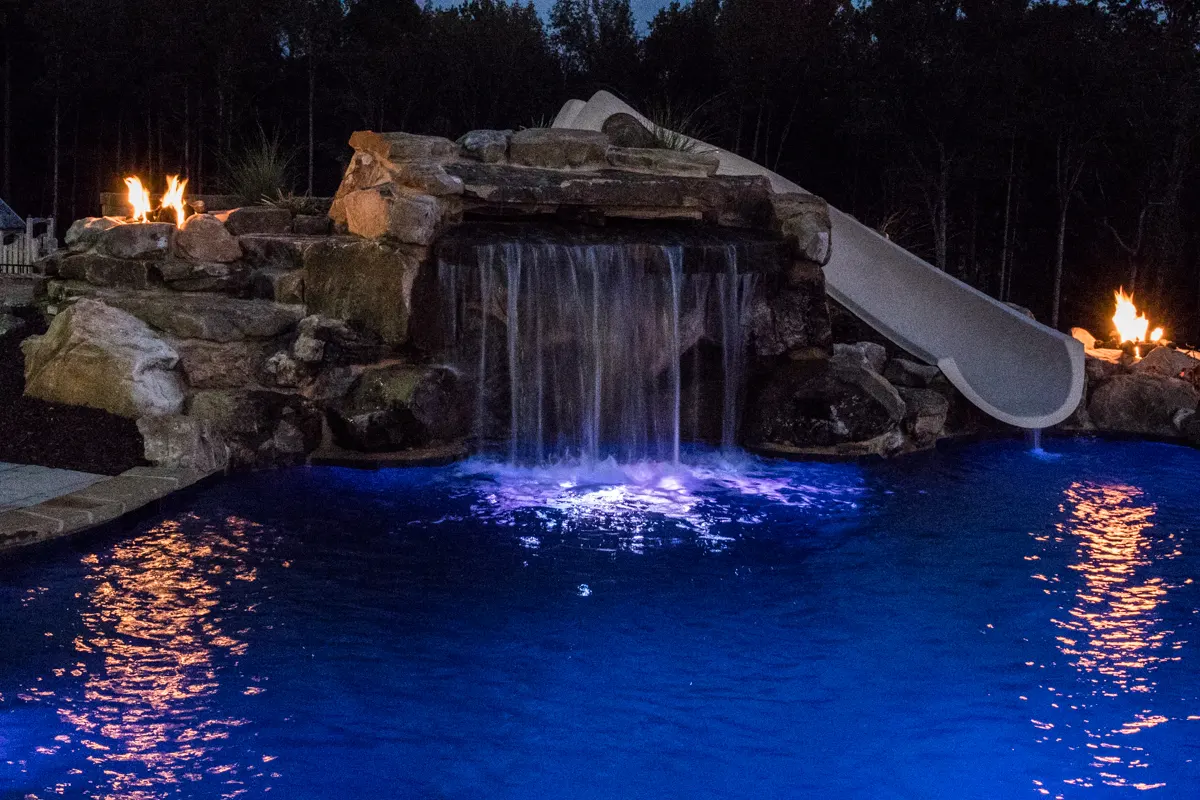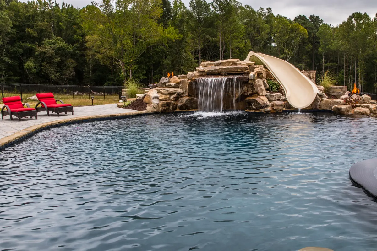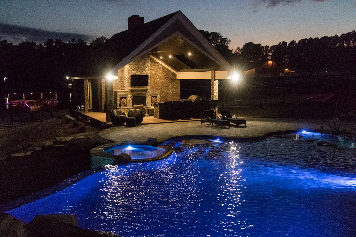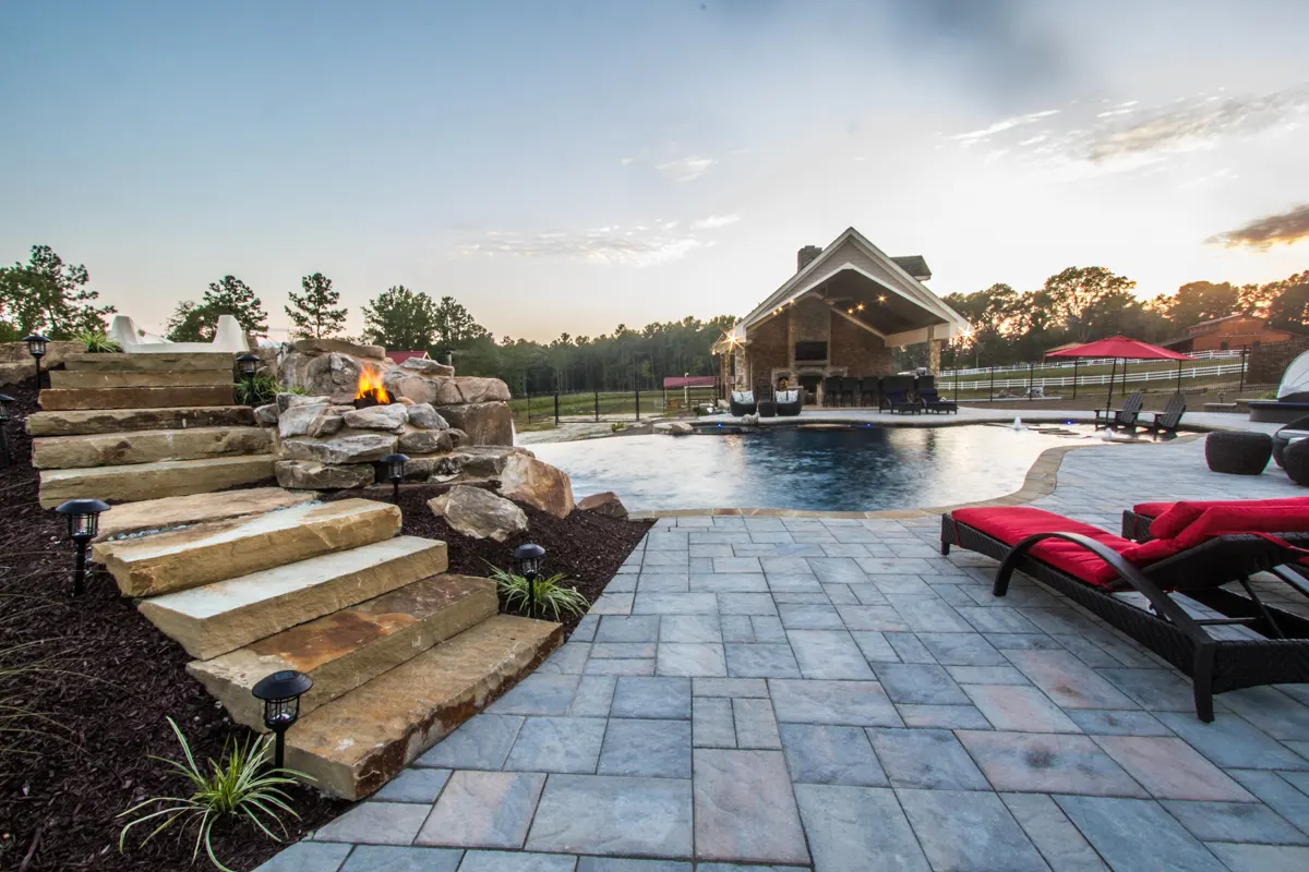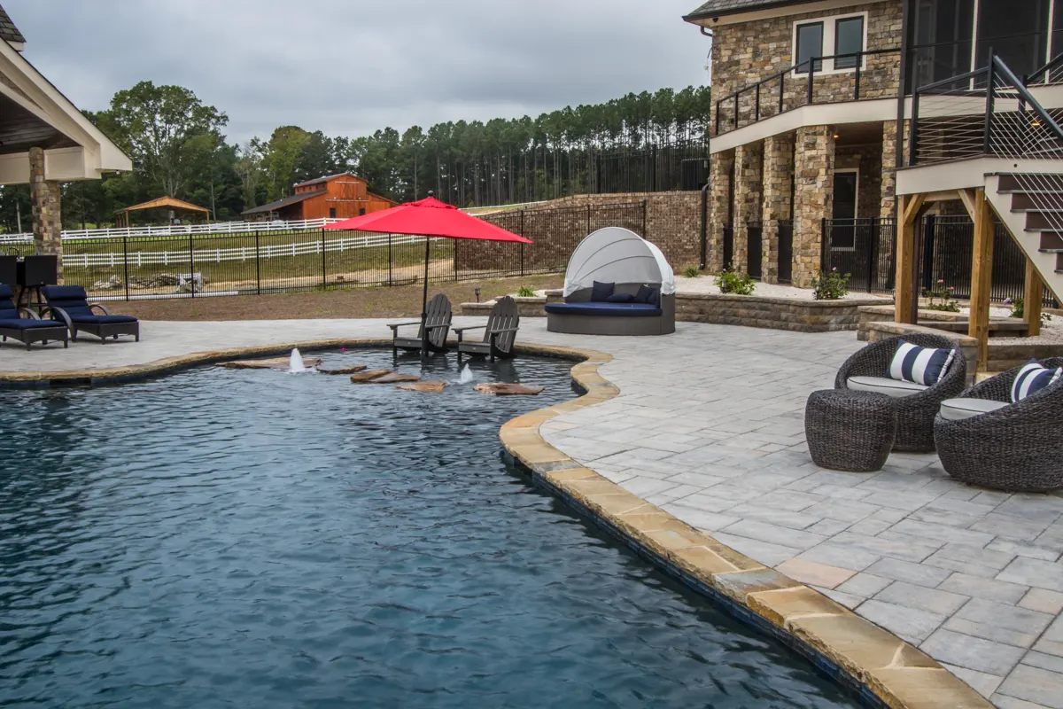 As featured on Season 5 Episode 6 (Slidin’ Into Home) of Pool Kings, we were hired to design a large pool with water features and a pool house on a 100 acre parcel a few miles north of Raleigh. There was a septic system and a lot of yard slope to contend with, as well as a special wood-burning heater for the home and swimming pool.