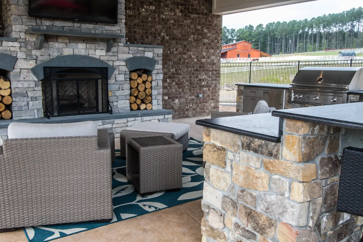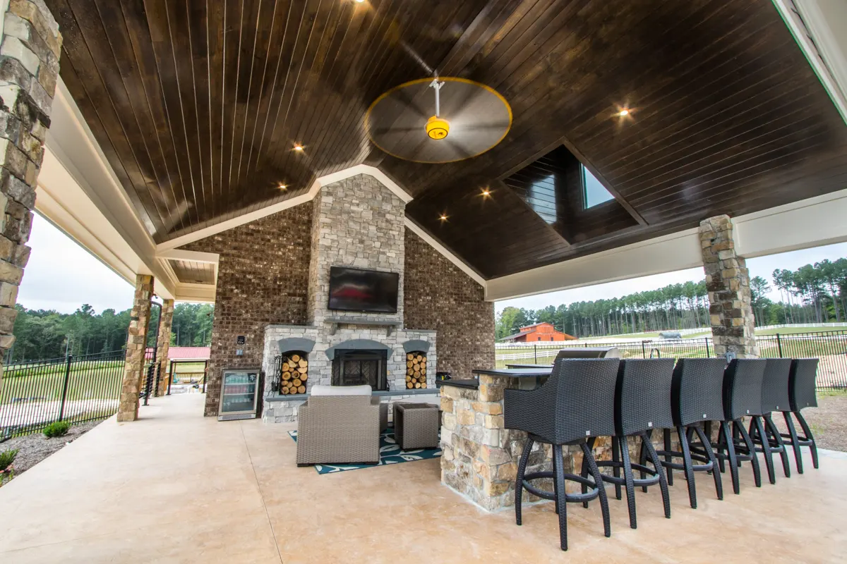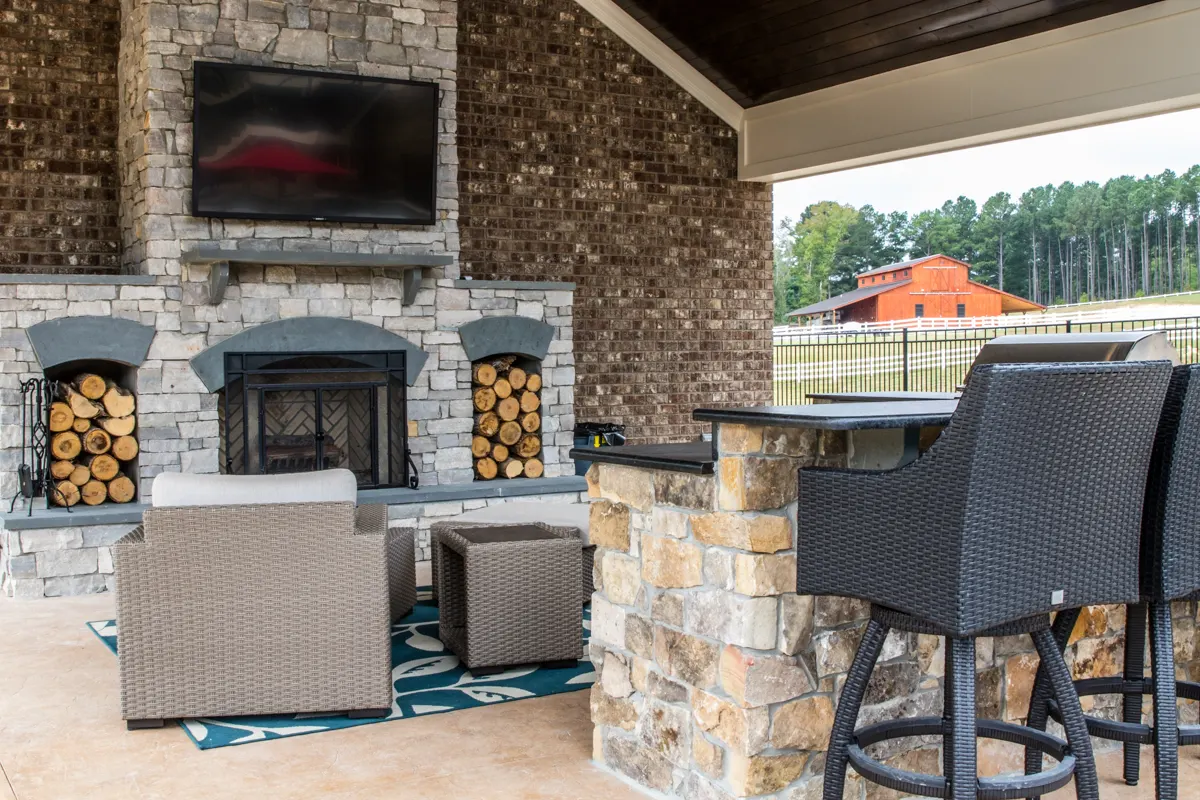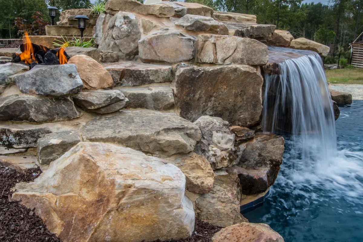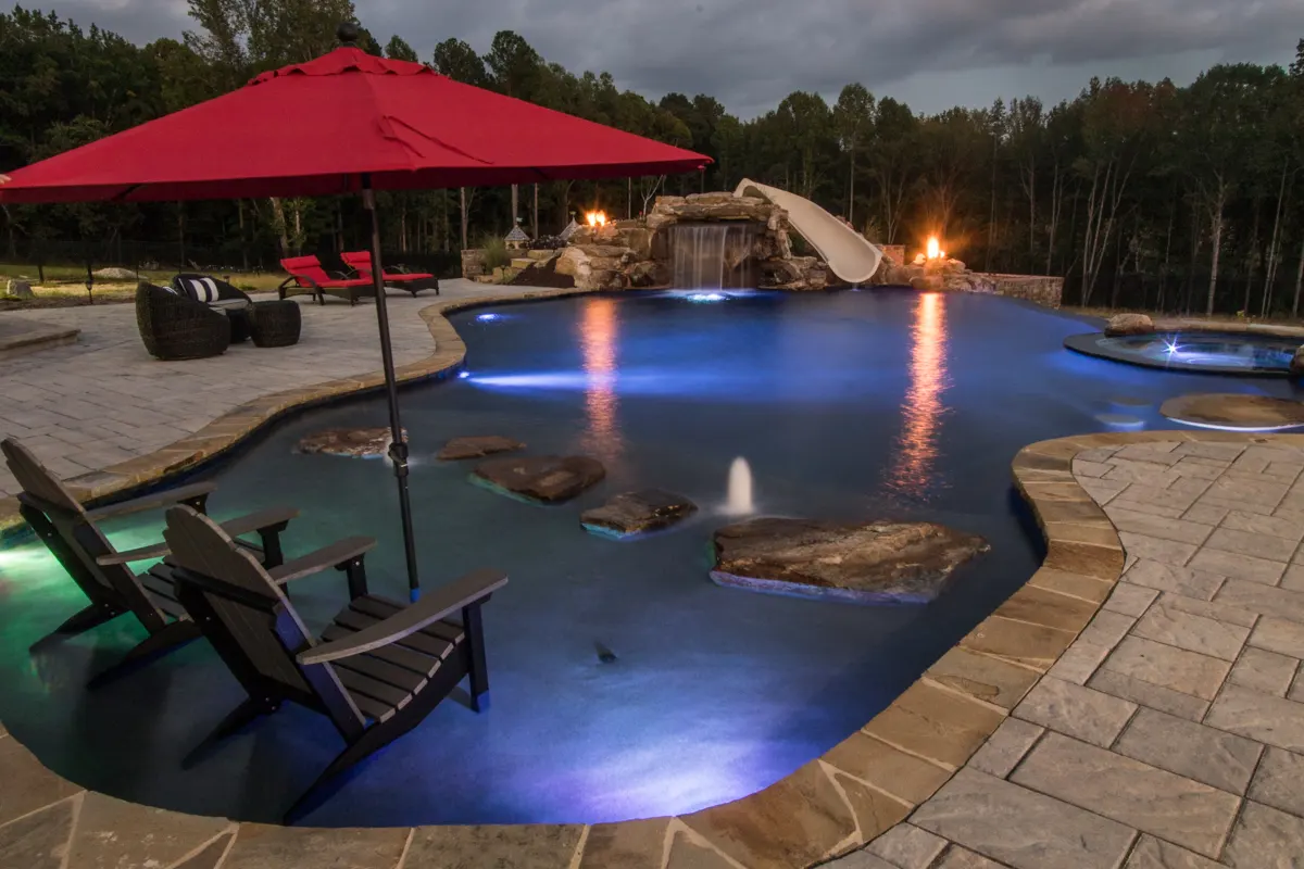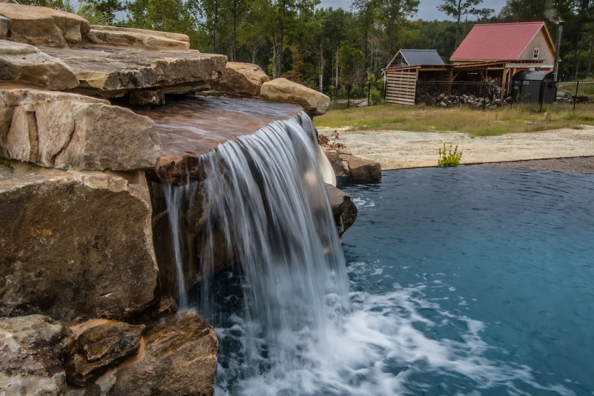 As featured on Season 5 Episode 6 (Slidin’ Into Home) of Pool Kings, we were hired to design a large pool with water features and a pool house on a 100 acre parcel a few miles north of Raleigh. There was a septic system and a lot of yard slope to contend with, as well as a special wood-burning heater for the home and swimming pool.