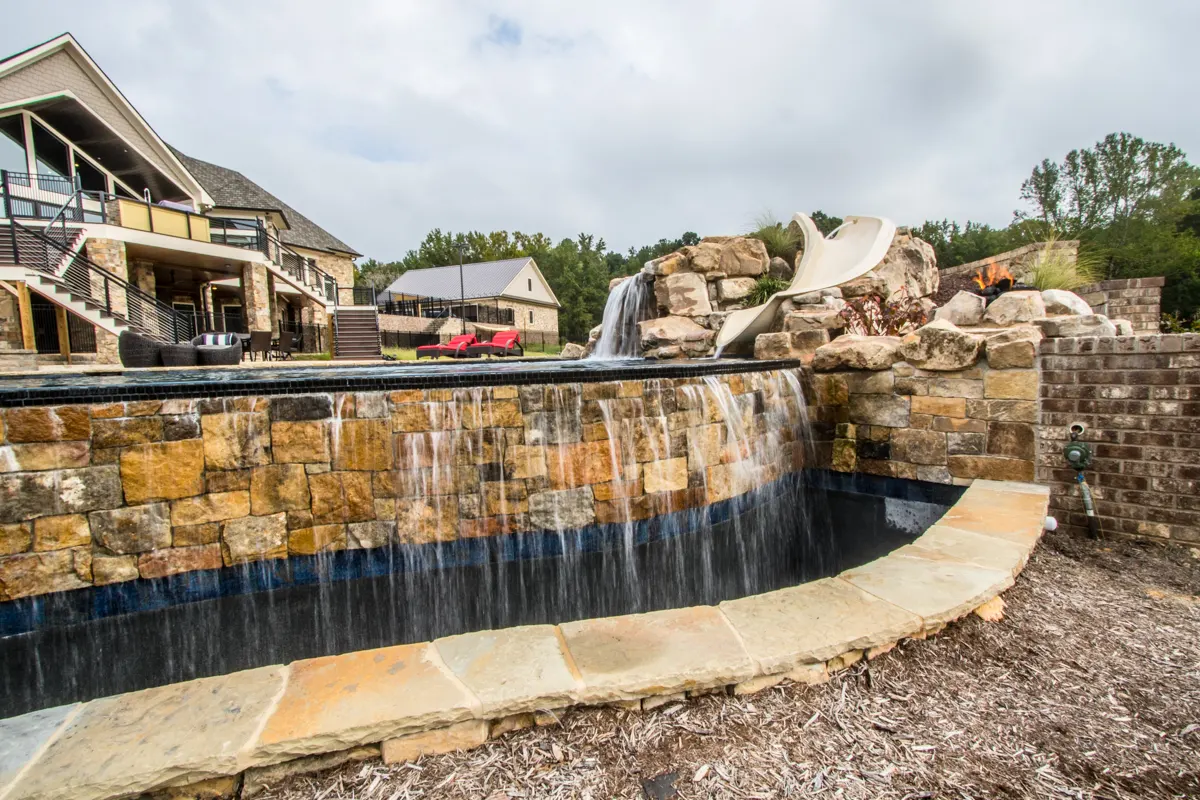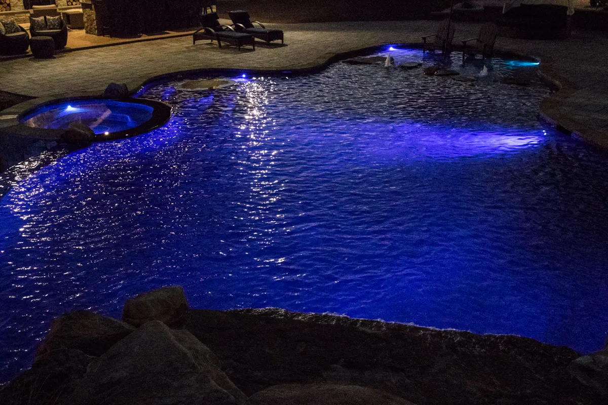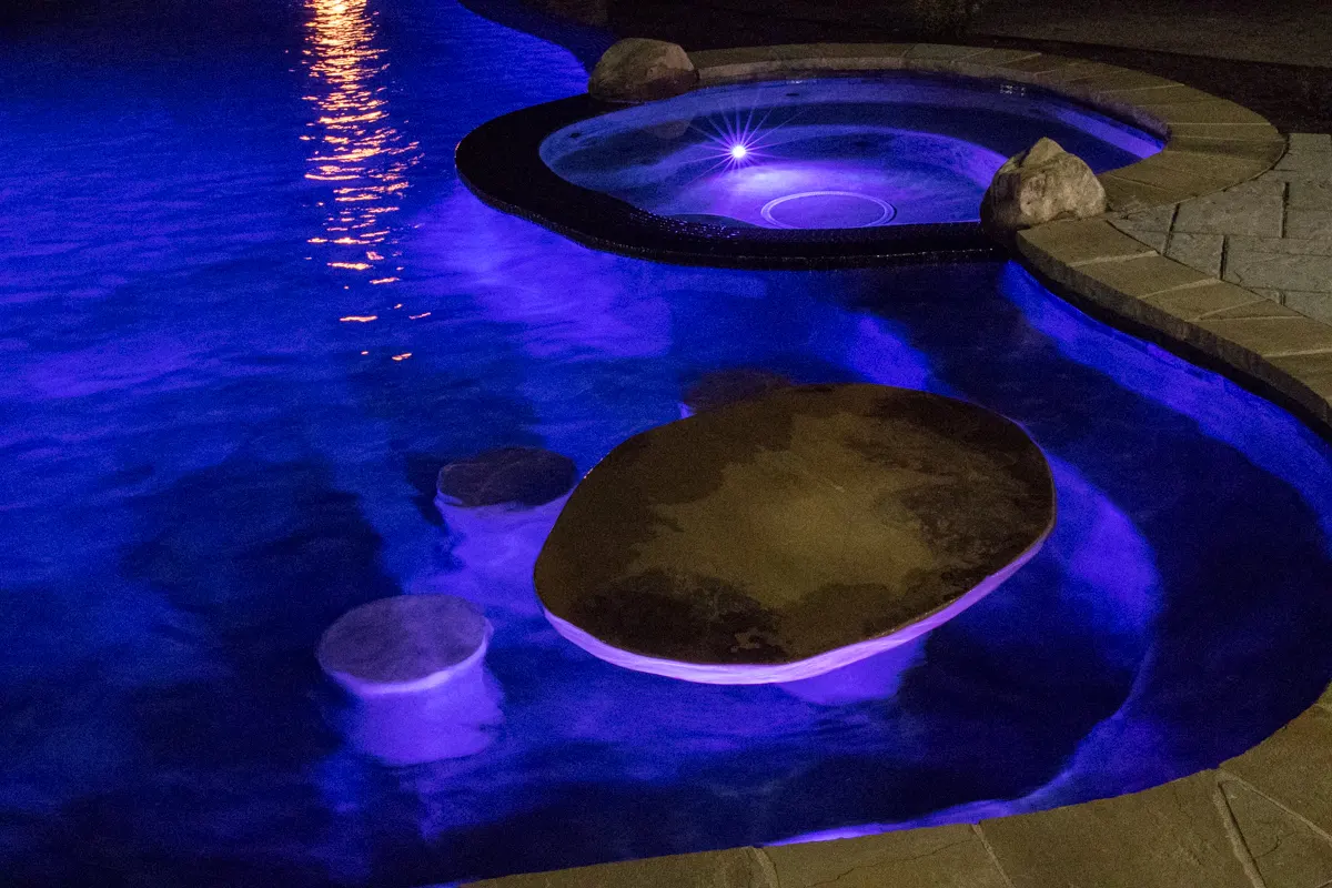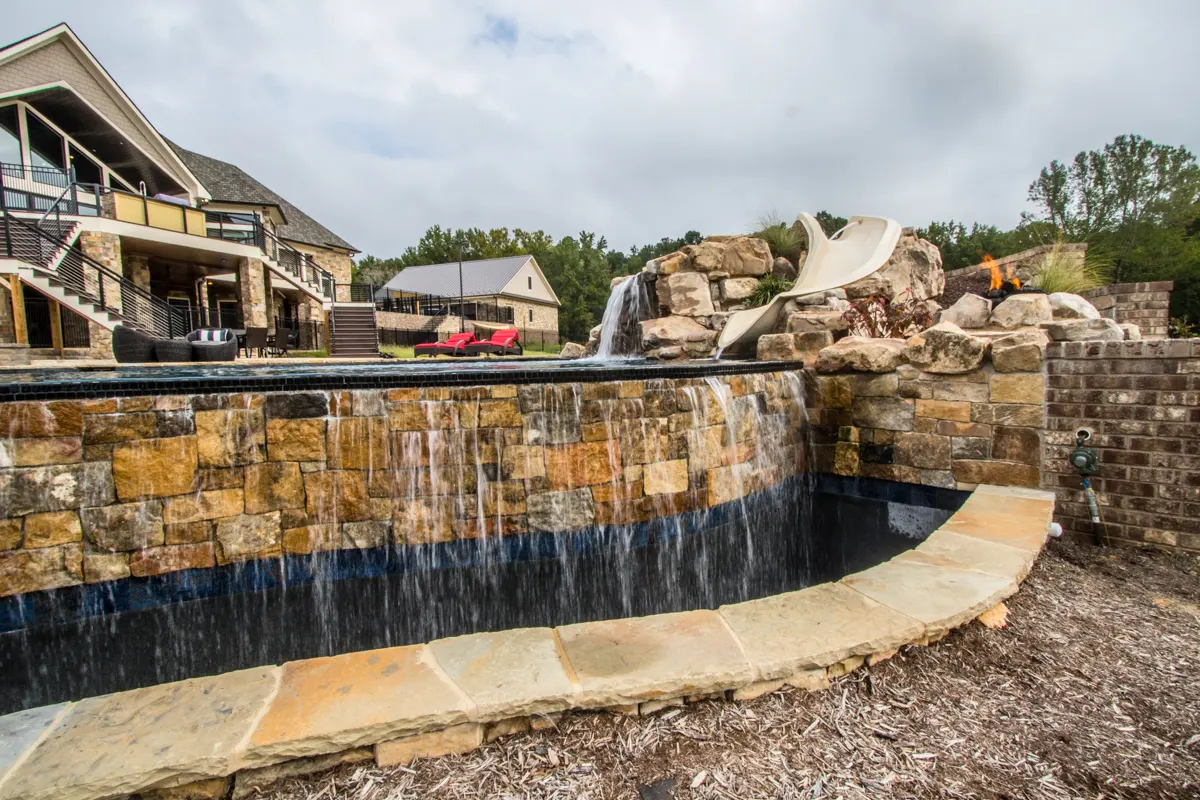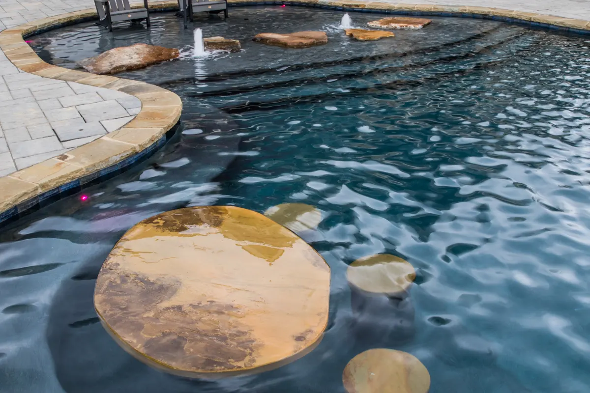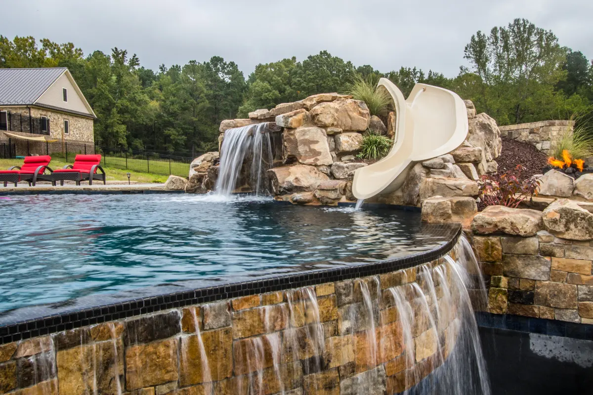 We created an amazing design complete with a large grotto and slide, vanishing edge, huge sun ledge with natural rock stepping stones that shortcut to the pool house, a flush spa that sits on an inch above the pool water, and a floating rock table inside the pool surrounded by a bench and barstools. This project highlights different textures in the design of the pool, from the smooth water of the spa to the rough splashes created by the grotto waterfall that tumbles over large stones on the vanishing edge.