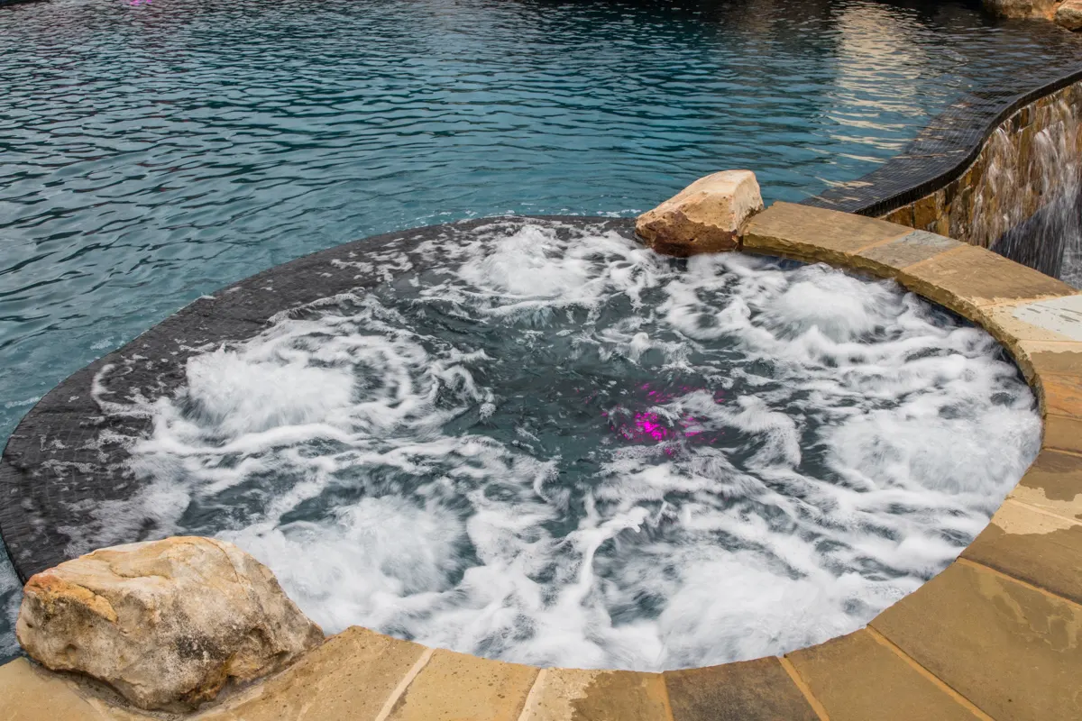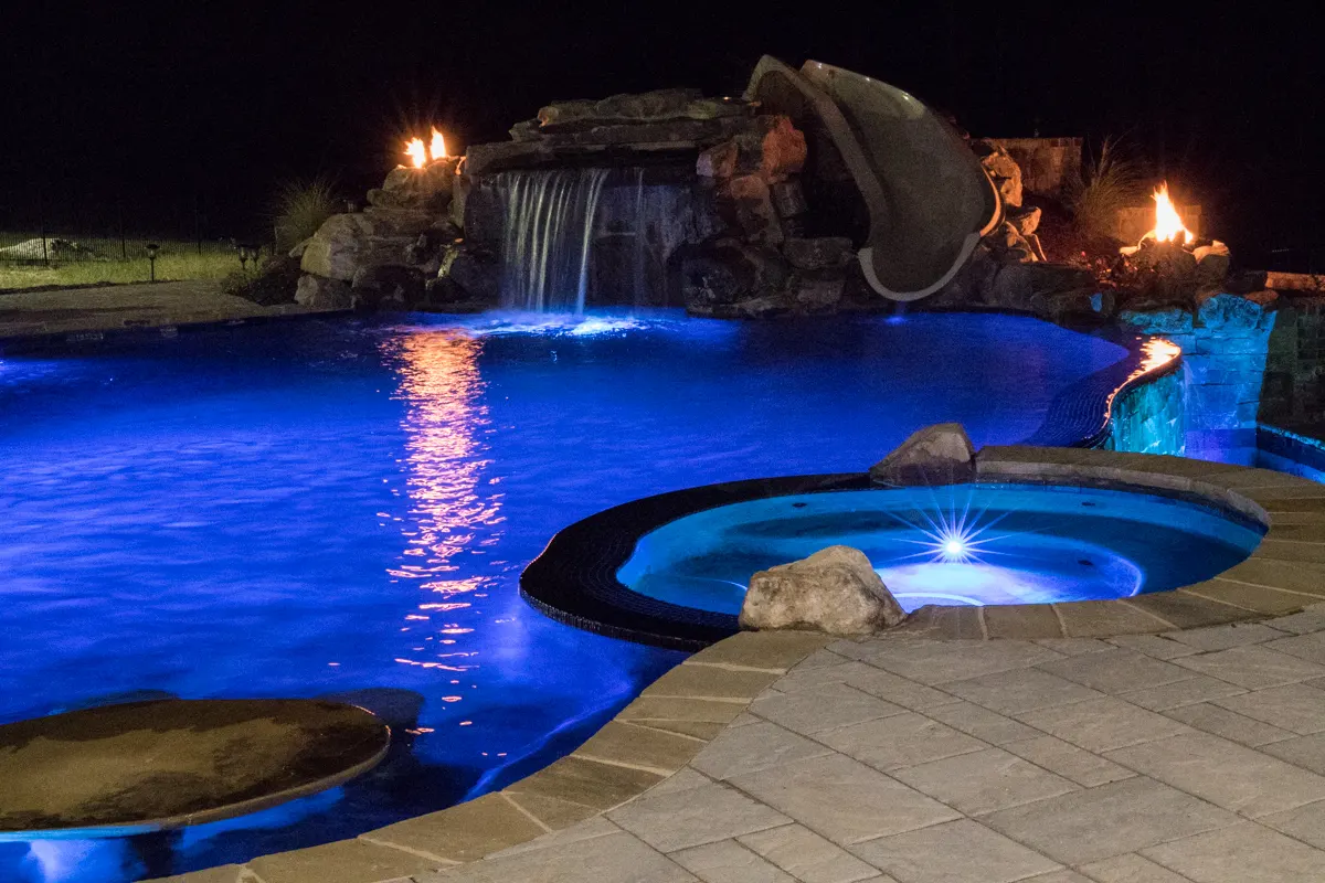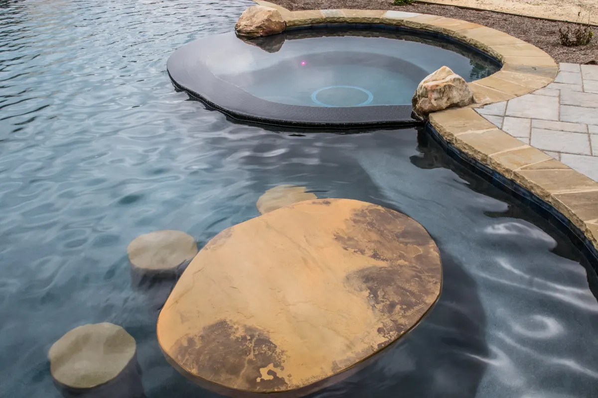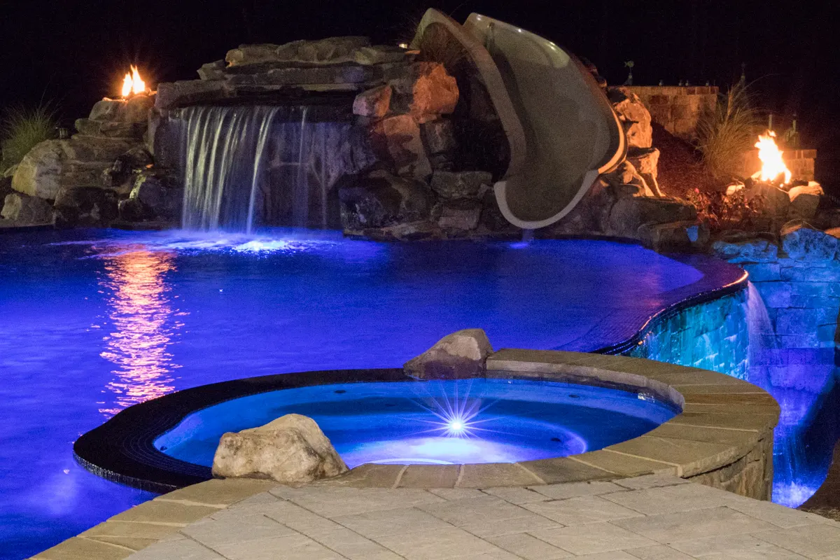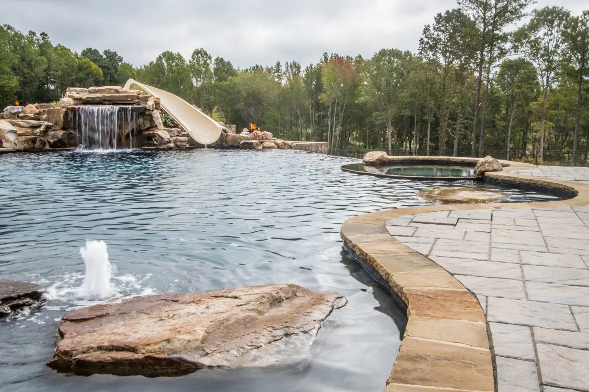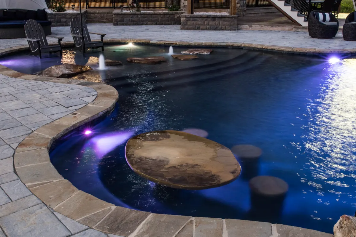 We created an amazing design complete with a large grotto and slide, vanishing edge, huge sun ledge with natural rock stepping stones that shortcut to the pool house, a flush spa that sits on an inch above the pool water, and a floating rock table inside the pool surrounded by a bench and barstools. This project highlights different textures in the design of the pool, from the smooth water of the spa to the rough splashes created by the grotto waterfall that tumbles over large stones on the vanishing edge.