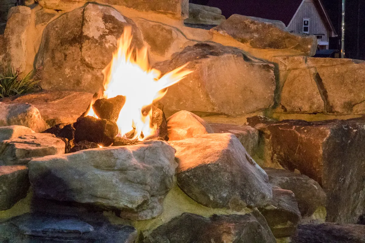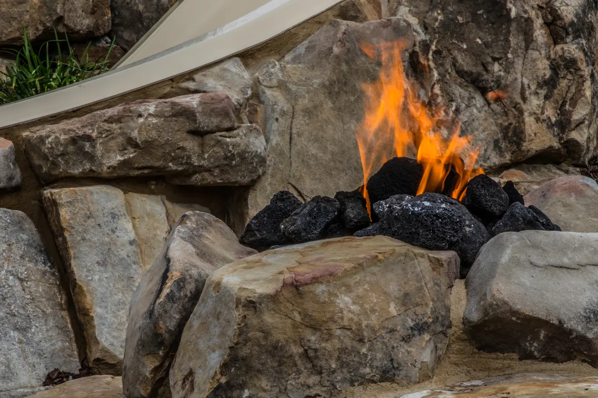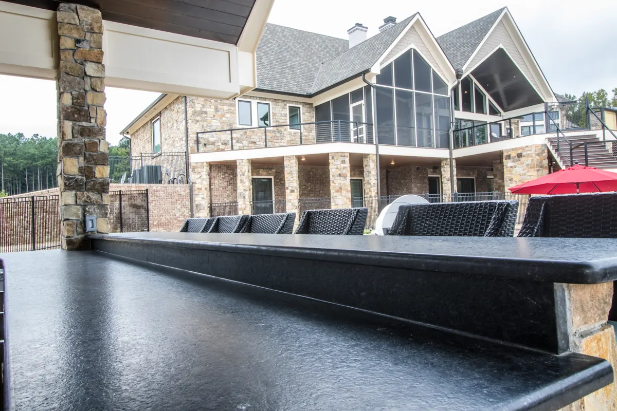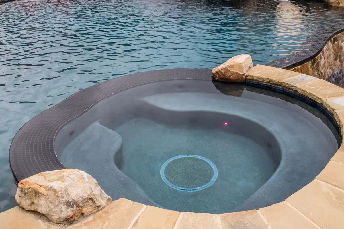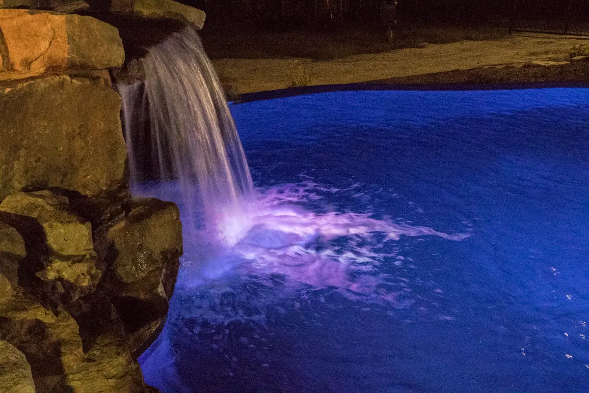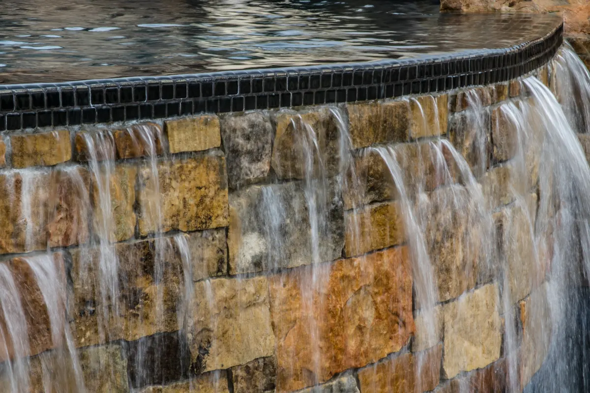 We created an amazing design complete with a large grotto and slide, vanishing edge, huge sun ledge with natural rock stepping stones that shortcut to the pool house, a flush spa that sits on an inch above the pool water, and a floating rock table inside the pool surrounded by a bench and barstools. This project highlights different textures in the design of the pool, from the smooth water of the spa to the rough splashes created by the grotto waterfall that tumbles over large stones on the vanishing edge.