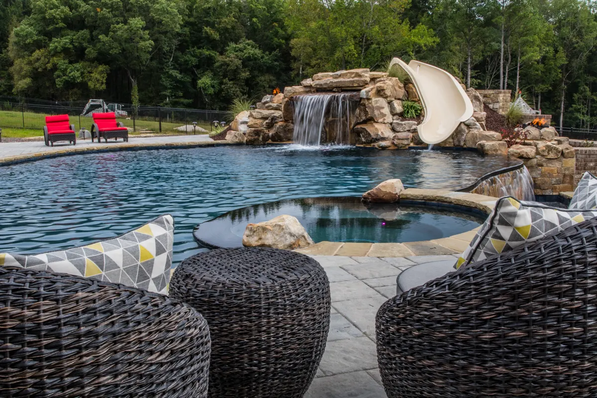 This project features: a custom pool and spa complete with a natural stone grotto, water slide, and floating table.