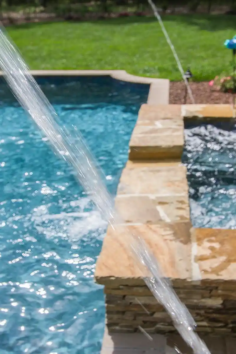 The McAdams came to us to design and build a classic spa and Roman End pool in an area that had previously been plagued with drainage issues. In order to combat the drainage problem, we installed the pool and patio a few steps higher than the grade of the lawn. This allowed us to redirect rainwater around the pool area and away from the home, enabling us to continue with the construction of this simple yet stunning backyard space.