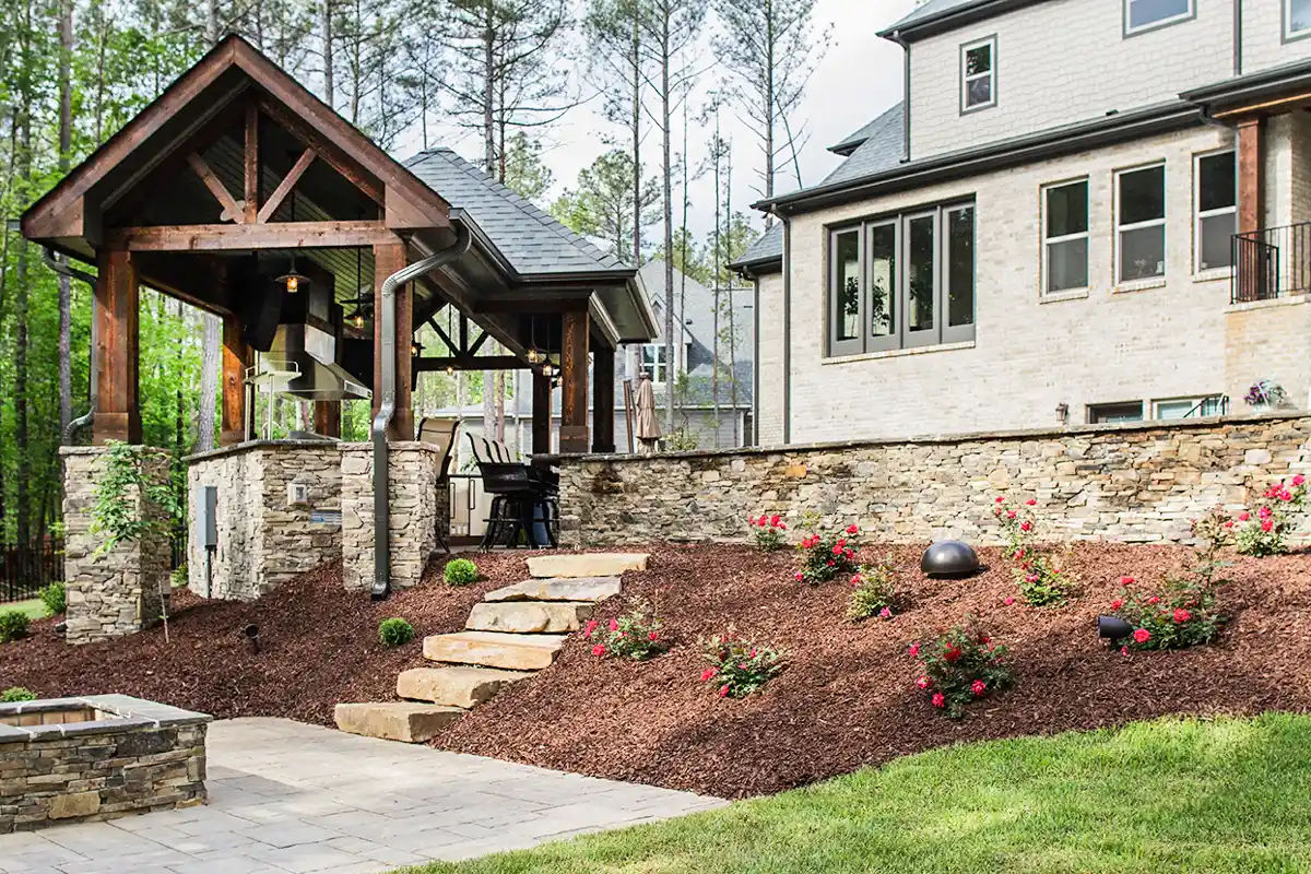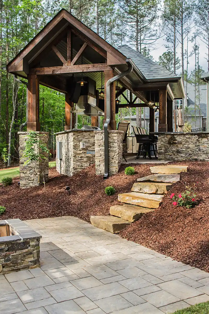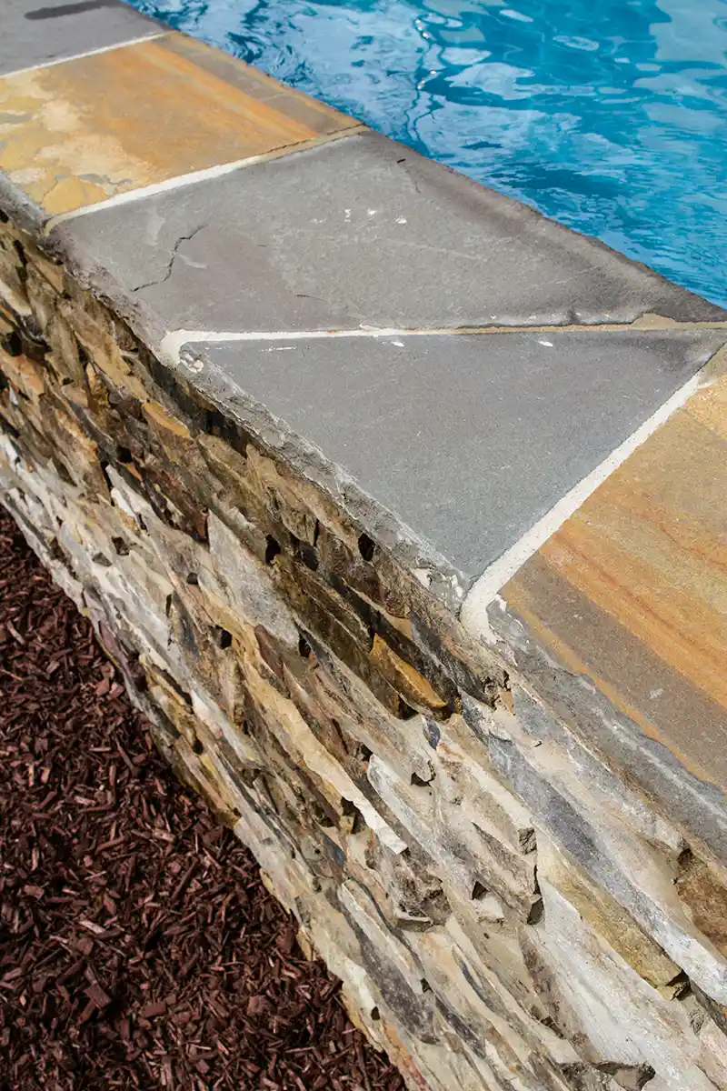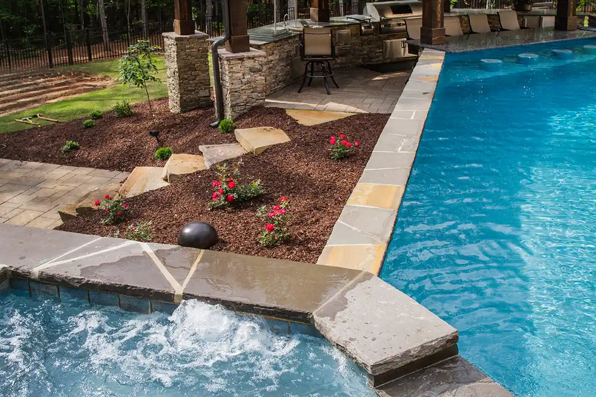 This project involved the construction of a sprawling backyard paradise that is perfect for entertaining large groups of friends or family. The covered outdoor kitchen and grill area provides access to the wet/dry bar, while TVs are visible from both the pool and bar. The fire pit rests just a few steps away from the kitchen area, while the attached spa sits nestled on the corner of the pool, overlooking the rest of the property. Custom water fountain jets add to the aesthetic appeal of the space, while access to the home’s multi-level rooms is still maintained throughout the backyard via stone stairs and paved pathways.