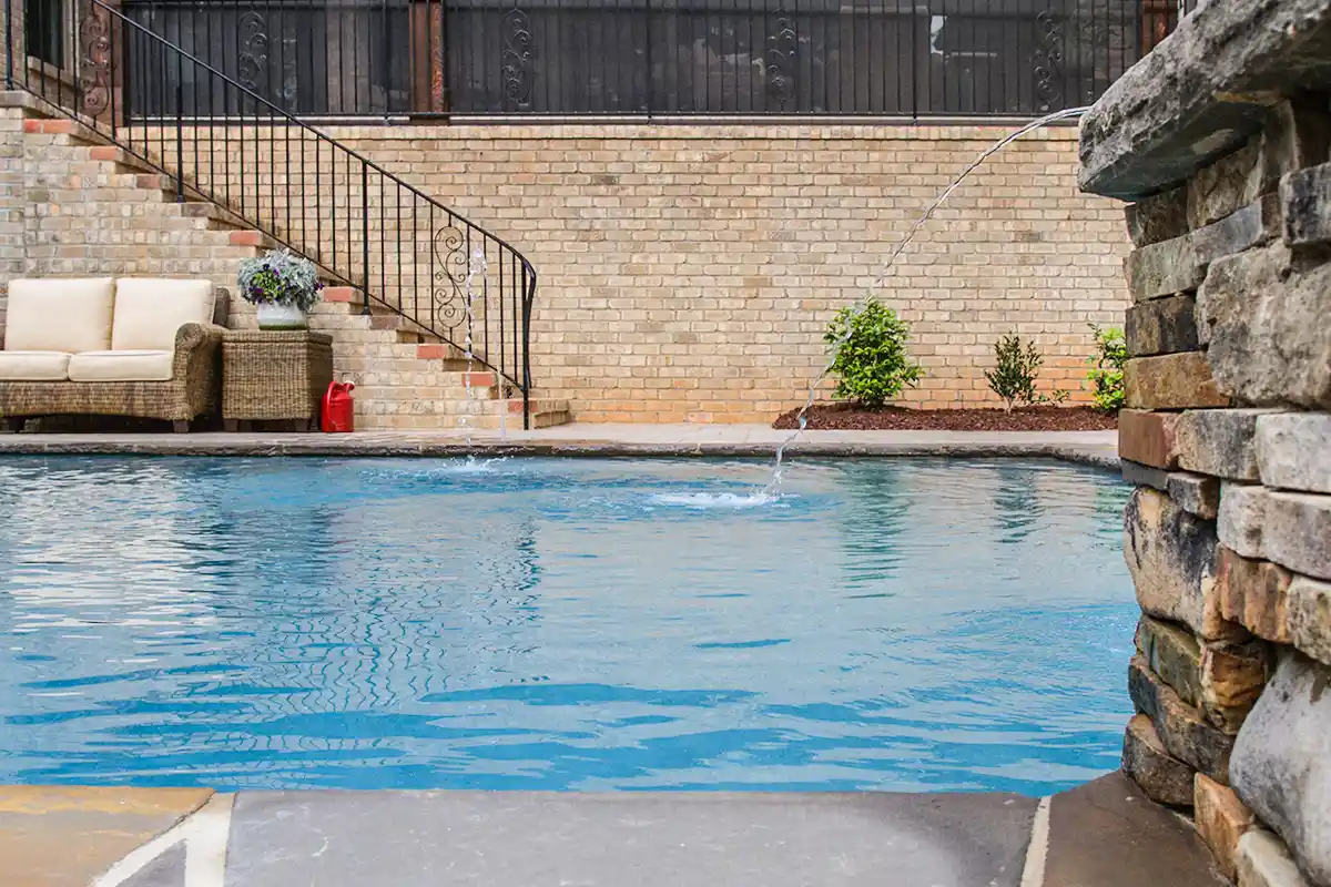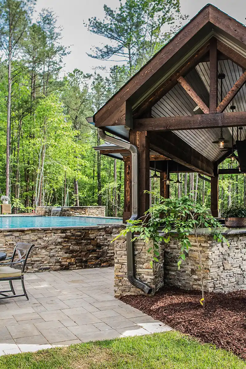 This project features a large rectangular pool design, geometric spa, covered outdoor kitchen, swim up wet/dry bar, stone fire pit, custom water fountains.