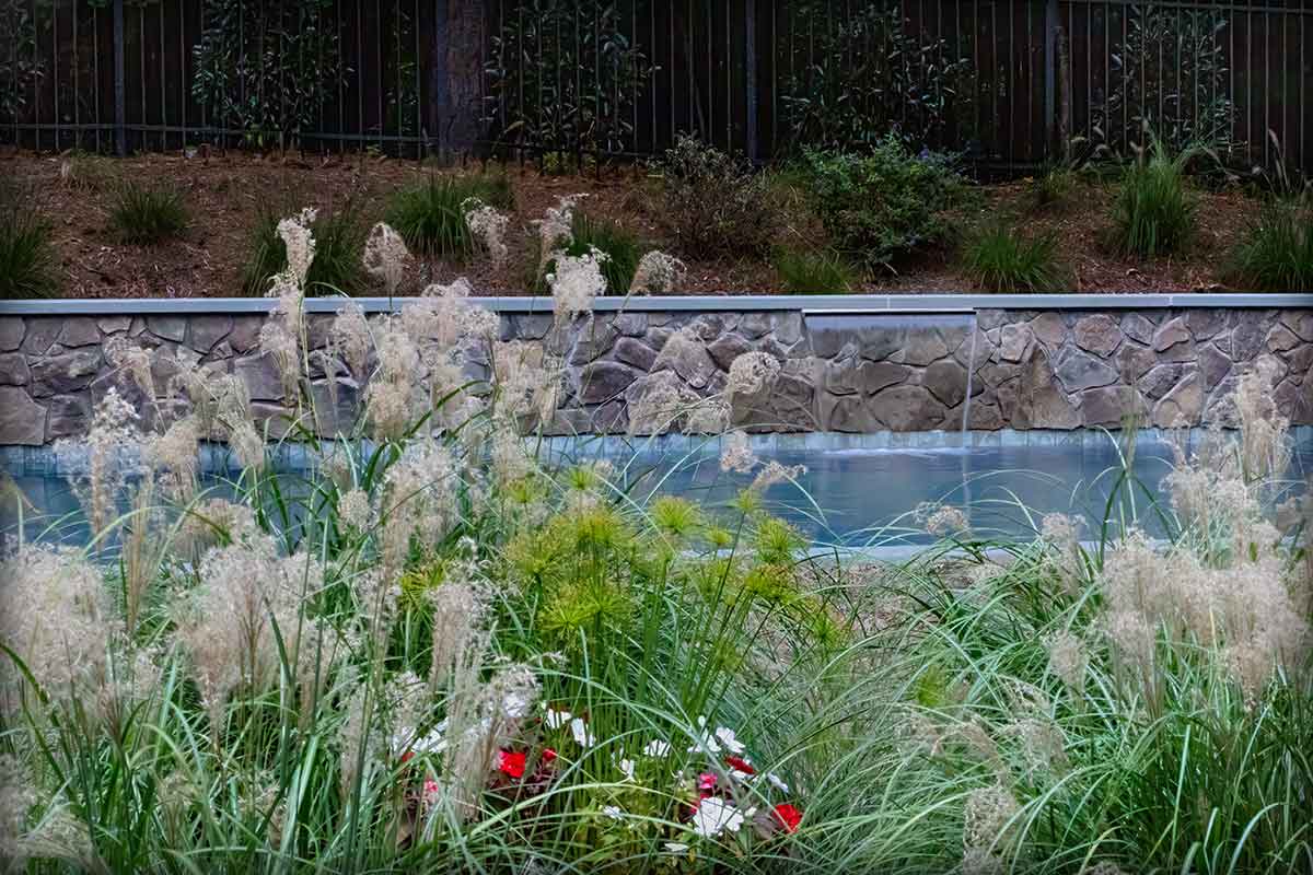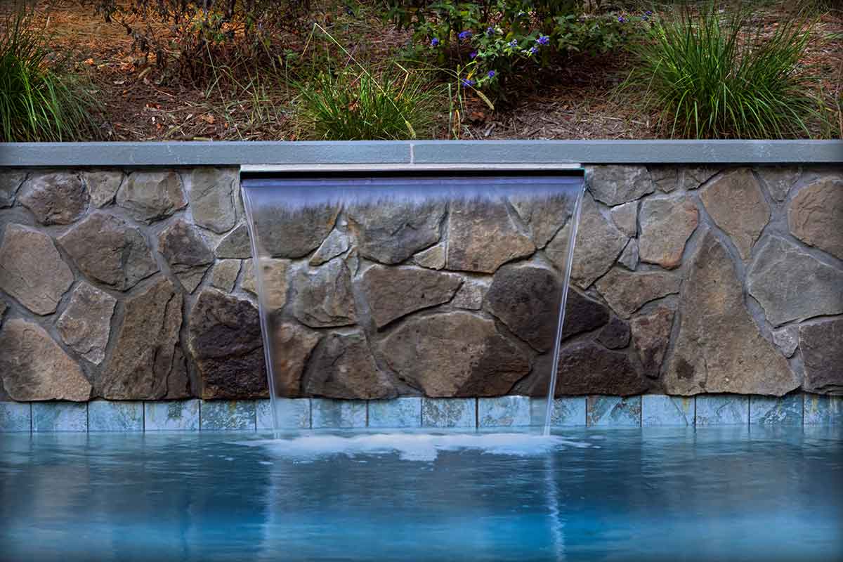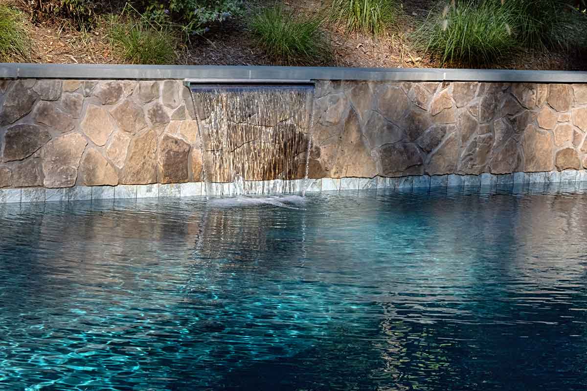 For this project, we transformed a garden space into a modern hillside pool that blends functionality with clean design. To accommodate the slope, we constructed a raised stone pool wall that not only provides structure but also serves as a natural drainage solution for water coming off the hillside. At the center of the design is a striking 3-foot copper fountain, adding movement and a touch of artistry to the space.