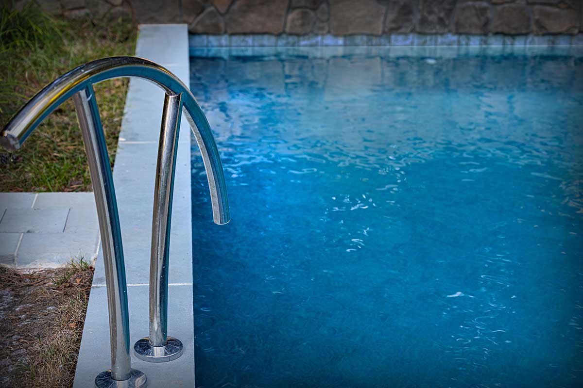 The pool itself was designed primarily for water aerobics, featuring a mostly flat bottom to make exercises easier and safer. A custom modern handrail was installed to provide both convenience and style, ensuring effortless entry and exit. With no patio included in the scope, we placed the pool equipment in a discreet location nearby to keep the view uncluttered.